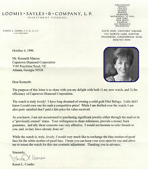 ![]() | October 4, 1996 Dear Kenneth: The purpose of this letter is to share with you my delight with both 1) my new watch, and 2) the efficiency of Capetown Diamond Corporation. As you know, I am not accustomed to purchasing significant jewelry either through the mail or in a "previously owned" status. Your willingness to share references, provide a money back guarantee, and ally these concerns was very effective. I would not hesitate to refer friends to you, and, in fact, have already done so! Sincerely,