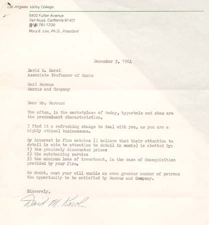 Dear Mr. Marcus: Too often, in the marketplace of today, hyperbole and sham are the predominant characteristics. I find it a refreshing change to deal with you, as you are a highly ethical businessman. My interest in fine watches (I believe that their attention to detail is akin attention to detail in music) is abetted by: