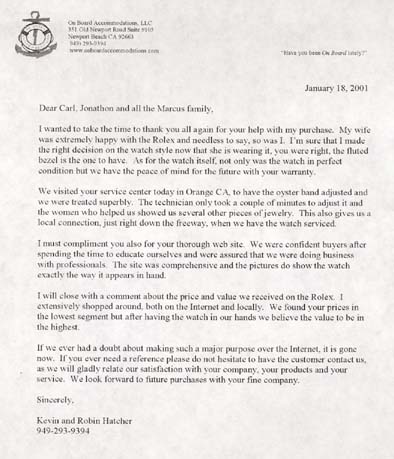 Dear Carl, Jonathan, and all the Marcus family, I wanted to take the time to thank you all again for your help with my purchase. My wife was extremely happy with the Rolex and needless to say, so was I. I'm sure that I made the right decision on the watch style now that she is wearing it, you were right, the fluted bezel is the one to have. As for the watch itself, not only was the watch in perfect condition but we have the peace of mind for the future with your warranty. We visited your service center today in Orange CA to have the oyster band adjusted and we were treated superbly. The technician only took a couple of minutes to adjust it and the women who helped us showed us several other pieces of jewelry. This also give us a local connection, just right down the freeway, when we have the watch serviced. I must compliment you also for your thorough web site. We were confident buyers after spending the time to educate ourselves and were assured that we were doing business with professionals. The site was comprehensive and the pictures do show the watch exactly the way it appears in hand. I will close with a comment about the price and value we received on the Rolex. I extensively shopped around, both on the Internet and locally. We found your prices in the lowest segment but after having the watch in our hands we believe the value to be in the highest. If we ever had a doubt about making such a major purchase over the Internet, it is gone now. If you ever need a reference, please do not hesitate to have the customer contact us, as we will gladly relate our satisfaction with your company, your products and your service. We look forward to future purchases with your fine company.