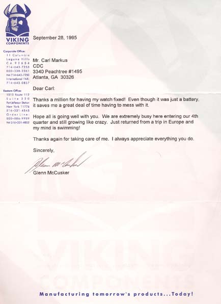 Dear Carl: Thanks a million for having my watch fixed! Even though it was just a battery, it saves me a great deal of time having to mess with it. Hope all is going well with you. We are extremely busy here entering our 4th quarter and still growing like crazy. Just returned from a trip in Europe and my mind is swimming! Thanks again for taking care of me. I always appreciate everything you do.