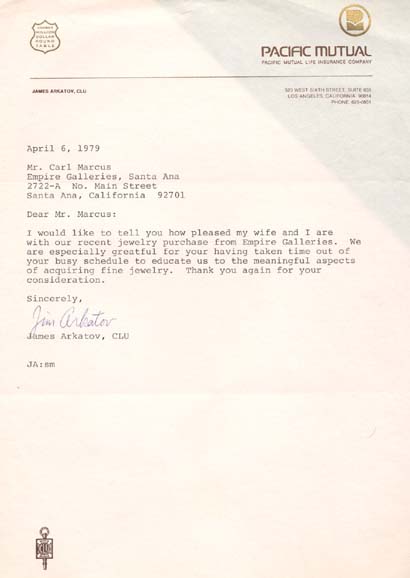 Dear Mr. Marcus: I would like to tell you how pleased my wife and I are with our recent jewelry purchase from Empire Galleries. We are especially grateful for your having taken time out of your busy schedule to educate us to the meaningful aspects of acquiring fine jewelry. Thank you again for your consideration. Sincerely,