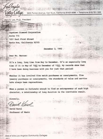 Dear Mr. Marcus: It's a long, long time from May to December. It's an especially long time if it is May of 1982 to December of 1992. My records show that I have been doing business with you for just that period! Whether it has involved fine watch purchases or consignments, fine jewelry purchases or consignments, the standards of value and service have always been reproachless. When a person is fortunate enough to find an entrepreneur of such high character, a relationship of long duration is the inevitable result.