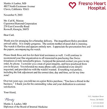 Dear Carl, Thank you for arranging for a Saturday delivery. The magnificent Rolex president arrived safely. It is simply gorgeous. The custom mother-of-pearl dial is stunning. The watch is flawless and appears entirely new. I appreciate the presentation box and the papers, accompanying the watch. Please thank Rose and Jon for their kind assistance as well. I will continue to recommend your fine organization to all interested in purchasing fine Swiss timepieces at truly remarkable prices. I enjoyed the personal contact you gave to my order, by phone. I consider you a man of great integrity, and have purchased from you in the past. You tolerated my many phone calls, considered every detail I requested, and provided me with the watch I wanted. Everything was perfect, including the link adjustment and the correct date, day, and time, set for my time zone! Over ten years ago, you told me on a prior Rolex purchase, "You have a friend in the business." I thank you for the outstanding value and your dedication to customer satisfaction. Your friend, Martin A. Lauber, MD