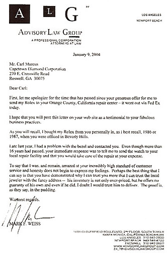 January 9, 2004 Dear Carl: First, let me apologize for the time that has passed since your generous offer for me to send my Rolex to your Orange County, California repair center - it went out via Fed Ex today. I hope that you will post this letter on your web site as a testimonial to your fabulous business practices. As you will recall, I bought my Rolex from you personally in, as I best recall, 1986 or 1987, when you were officed in Beverly Hills. Late last year [(2003)], I had a problem with the bezel and contacted you. Even though more than 16 years had passed, your immediate response was to tell me to send the watch to your local repair facility and that you would take care of the repair at your expense. To say that I was, and remain, amazed at your incredibly high standard of customer service and honesty does not begin to express my feelings. Perhaps the best thing that I can say is that you have demonstrated why I can trust you more than I can trust the local jeweler with the fancy address -- his inventory is not only over-priced, but he offers no guaranty of his own and even if he did, I doubt I would trust him to deliver. The proof is, as they say, in the pudding. Warmest Regards, Mark F. Weiss