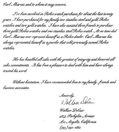 to whom it may concern: I've been involved in Rolex watch purchases for about the last twenty years. I have purchased for my family two stainless steel and gold Rolex watches and two gold watches. I have also assisted three friends to purchase three gold Rolex watches and one stainless steel Rolex watch. At no time did Carl Marcus ever represent himself as a Rolex dealer. Carl Marcus has always represented himself as a jeweler that sold previously owned Rolex watches. He has handled all sales with the greatest of integrity and honored all sales commitments. It has been a pleasure to deal with him and have always trusted his word. Without hesitant, I have recommended him to my family, friends and business associates. Wallace DeCuir |