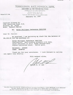 Dear Mr. Marcus: As promised, I am enclosing my check for the balance of $5,140.00 for the purchase of Patek Philippe; Reference 3802/200. Description: Self-winding movement with date. Water resistant to 25 m. Sweep seconds-hand. Hobnail-patterned bezel. Yellow gold. Thank you for your assistance. I look forward to calling you again very shortly. With warmest aloha, Wilson M. N. Loo |